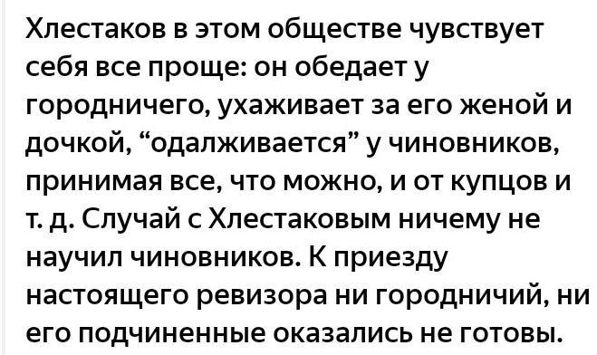 Хлестаков в этом обществе чувствует себя все проще: он обедает у городничего, ухаживает за его женой и дочкой, “одалживается” у чиновников, принимая все, что можно, и от купцов и т. д.