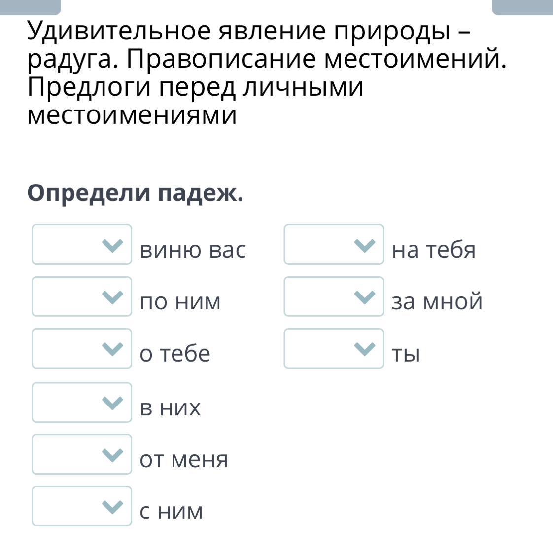 Ответ:виню вас:кого? что?винительный падеж,по ним:кому?чему?дательный падеж,о тебе:о ком?о чем?предложный падеж,в них:в ком?в чем?предложный падеж,от меня:кого?чего?Родительный падеж,с ним:кем?чем? Творительный падеж,на тебя:кого?что? Винительный падеж,за мной:кем? чем?Творительный падеж,