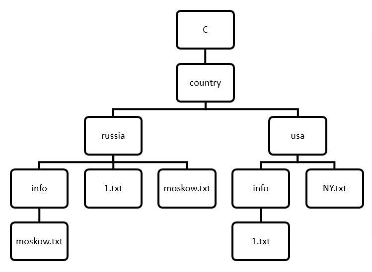 Папка 1 уровня - country (содержит 2 вложенные папки 2-го уровня - russia и usa)