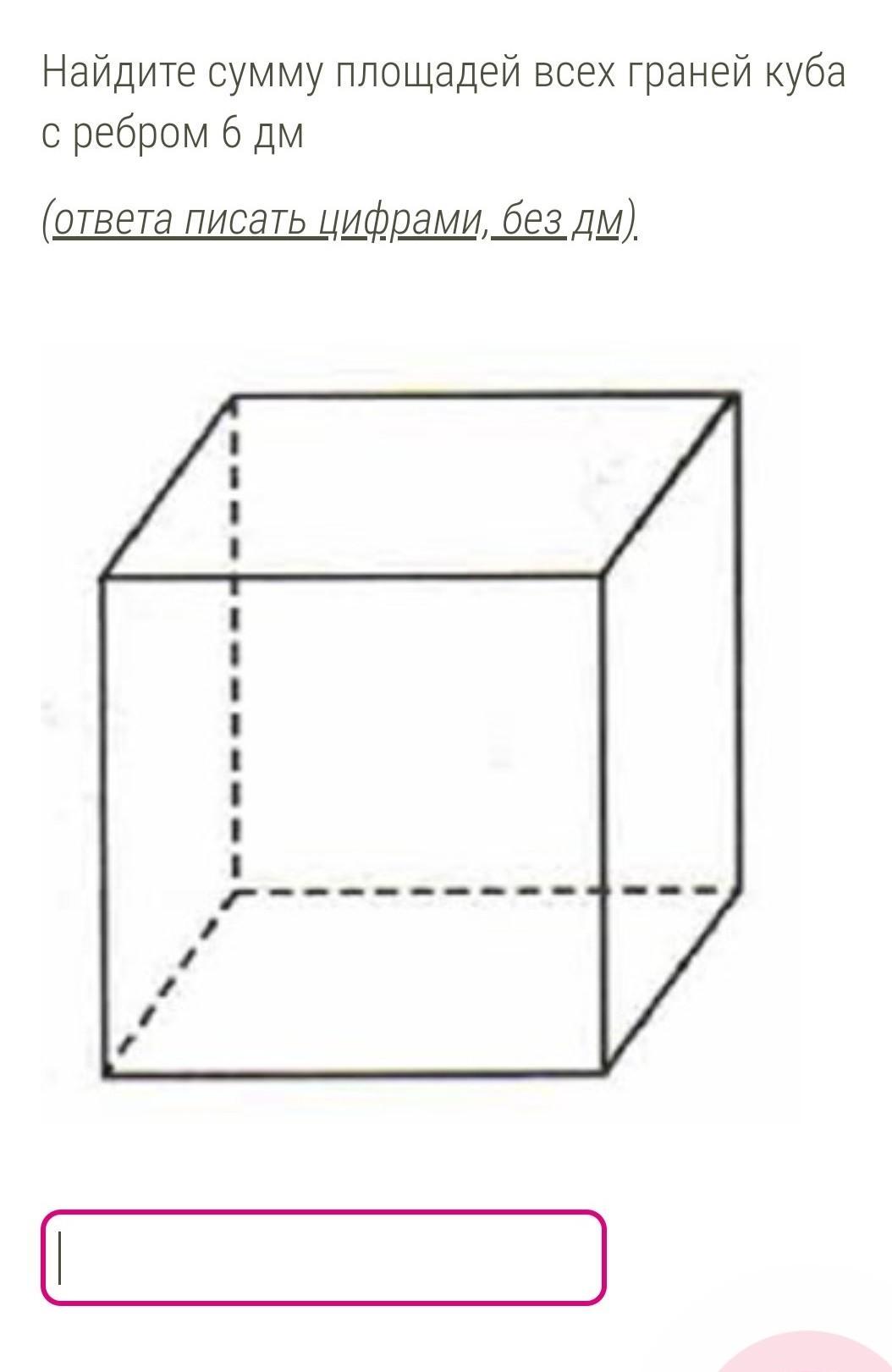 грань это сторона куба так как их шесть и они равны, находим площадь одной грани и умножаем на их количество, так как грань это квадрат, а ребро его сторона