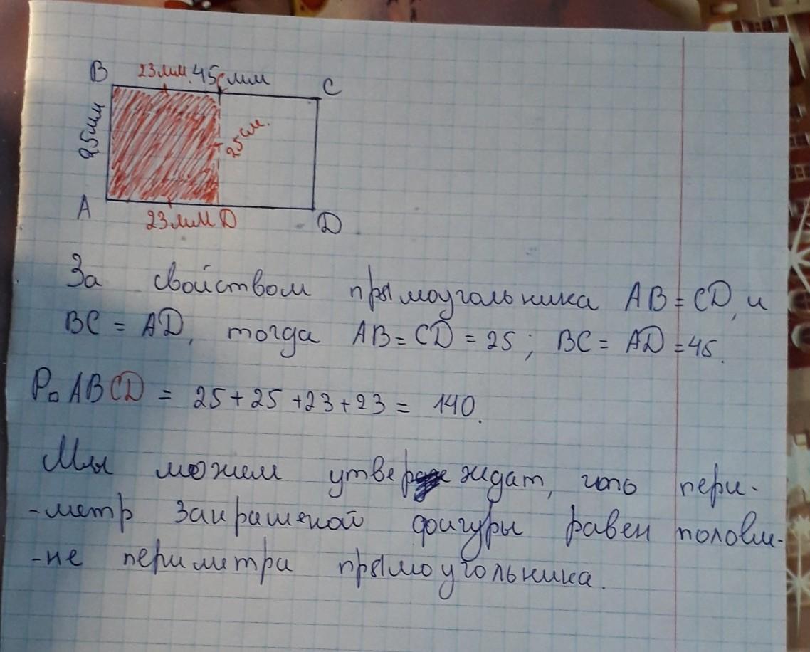 Построй прямоугольник АВСD со сторонами длиной 25 мм и 45 мм. Найди его периметр. Закрась красным карандашом половину прямоугольника ABCD. Вымиряй длины сторон закрашенной фигуры та найди её периметр. Можно ли утверждать , что периметр закрашенной фигуры равно половине периметра прямоугольника ABCD?