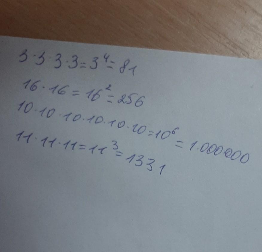 В первом примере тройка повторяется 4 раза, поэтому пишем 3^4=81.