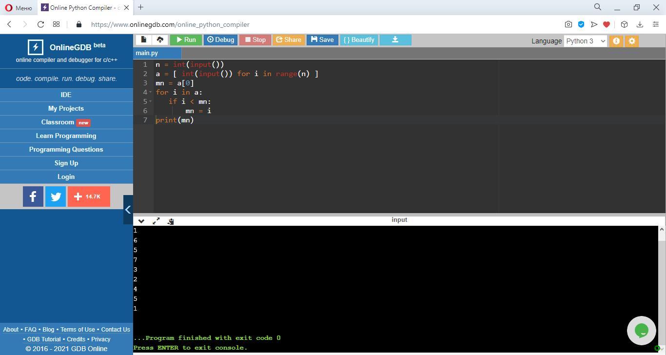 По примеру решения задач напишите программу для нахождения минимального элемента из массива.