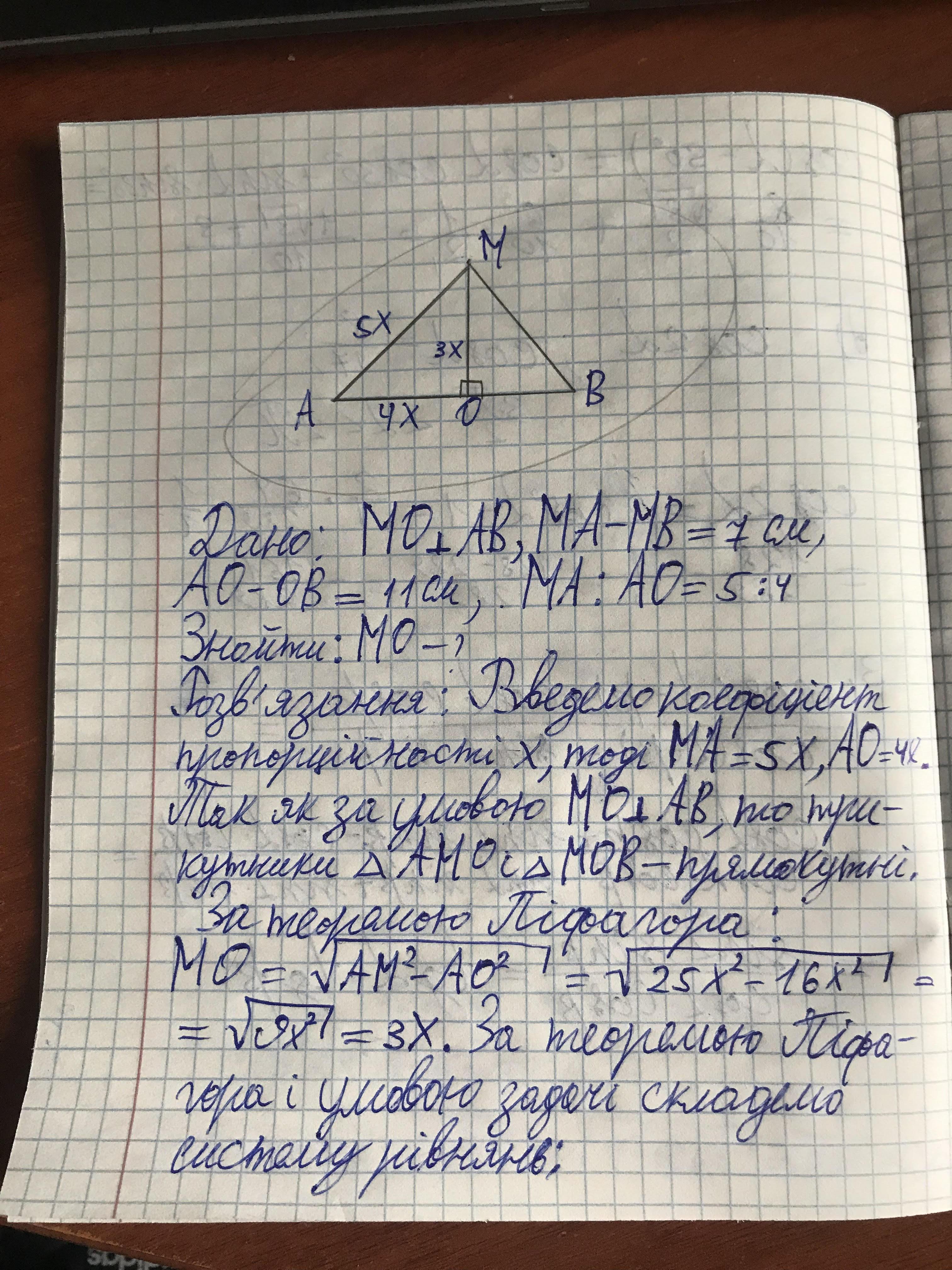 з точки м до площини проведено перпендикуляр мо і похилі ма і мб різниця між похилими дорівнює 7 см а між проекціями 11 см знайдіть довжину мо якщо більша похила відноситься до своєї проекції як 5:4