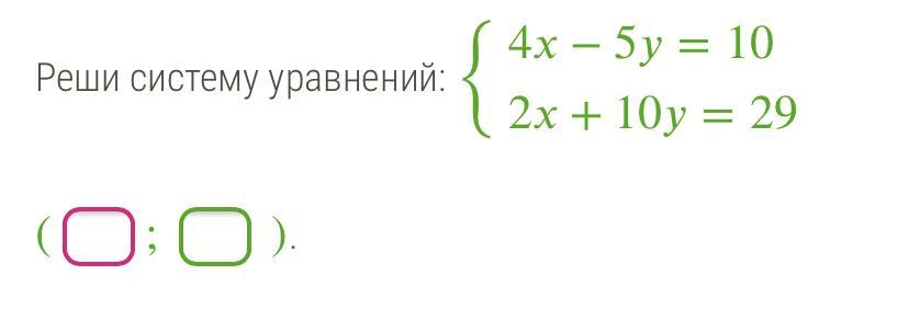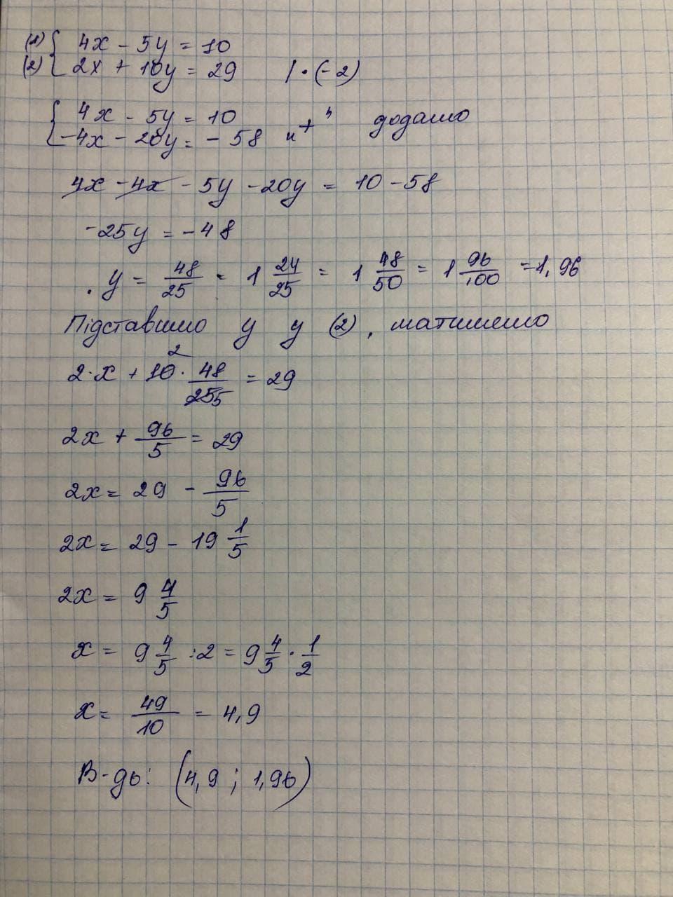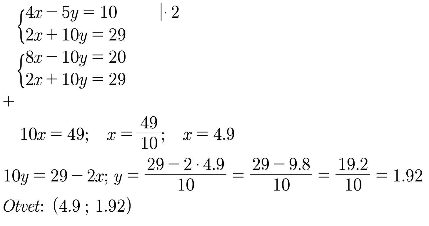 Друге рівняння домножаємо на (-2) та додаємо до першого. При скороченні отримаємо значення у=48/25. Підставимо в друге рівняння системи та знайдемо що х=4,9. Відповідь: (4,9; 1,96)