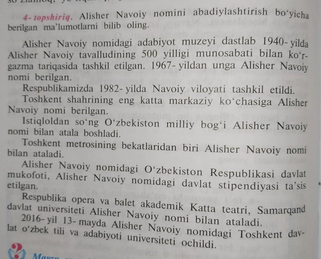 Задание 4. Узнайте об увековечивании имени Алишера Навои. Литературный музей имени Алишера Навои был основан в 1940 году как слепое пятно по случаю 500-летия со дня рождения Алишера Навои. В 1967 году его назвали Алишером Навои. Навоийская область образована в 1982 году. Самая большая центральная улица Ташкента носит имя Алишера Навои. После обретения независимости Национальный парк Узбекистана был переименован в Алишера Навои. Одна из станций ташкентского метро носит имя Алишера Навои. Государственная премия Республики Узбекистан имени Алишера Навои, Республиканский академический Большой театр оперы и балета имени Алишера Навои, Самаркандский государственный университет имени Алишера Навои. 13 мая 2016 года открылся Ташкентский университет узбекского языка и литературы имени Алишера Навои.