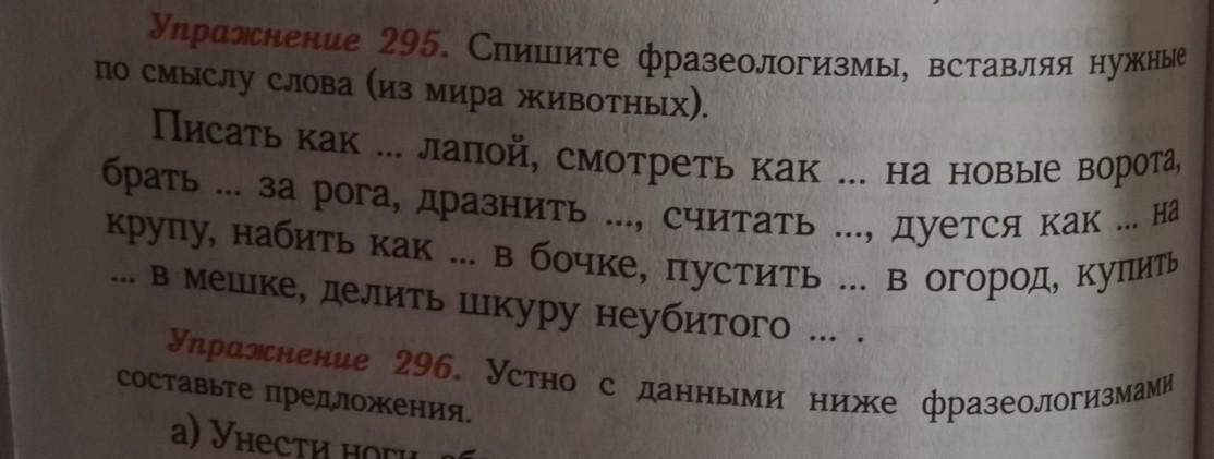 Писать как курица лапой, смотреть как баран на новые ворота, брать быка за рога, дразнить гусей, считать ворон, дуется как мышь на крупу, набить как сельдей в бочке, пустить козла в огород, купить кота в мешке, делить шкуру неубитого медведя.