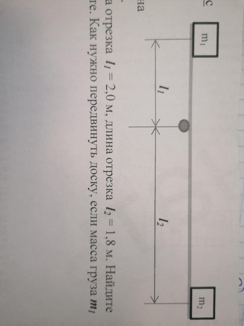 Два груза массами m1 =30 кг и m2 лежат на длинной доске, положенной на бревно. Доска находится в равновесии. Длина отрезка l1= 2,0 м, длина отрезка l2=1,8 м. Найдите массу груза m2. Массу доски не учитывайте. Как нужно передвинуть доске, если масса груза m1 увеличится вдвое?