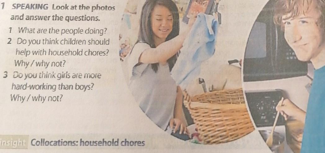 In the photo, the girl puts things or clothes in the basket, and the guy cooks.