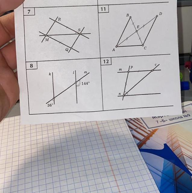 в 8 сумма смежных углов 180°, один 144, значит другой 36. он будет соответственным с другим углом, равным 36, значит если соответвенные углы равны, то прямые параллельны