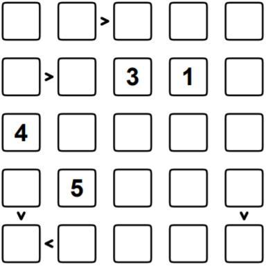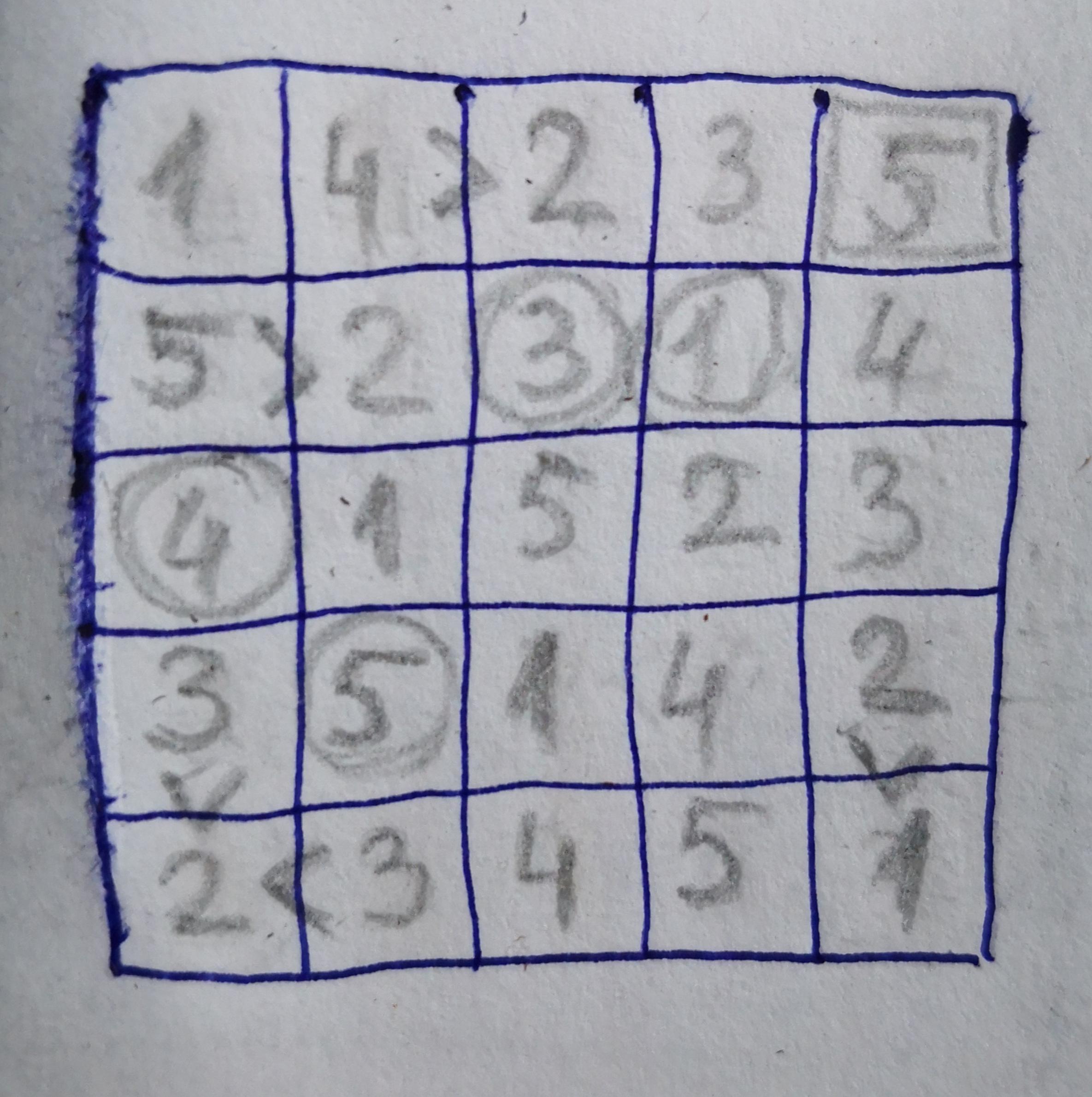 Т.е. во второй строке, где _>_ 3 1 _ , не хватает 2,4,5. Первой не может стоять 2, т.к. 2 меньше и 5 и 4, и не может стоять 4, т.к. в первом столбце уже есть 4. Значит первой будет идти 5. Получаем 5>_ 3 1 _ .