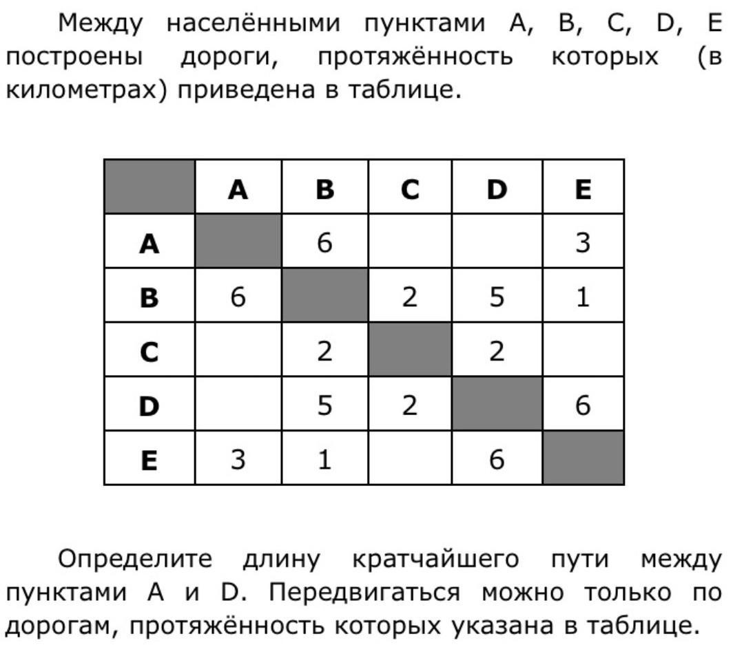 Между населёнными пунктами А, B, B, C, D, построены дороги, протяжённость которых (в километрах) приведена в таблице. Определите длину кратчайшего пути между пунктами А и D. Передвигаться можно только по дорогам, протяжённость которых указана в таблице.