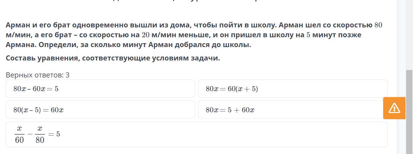 Арман и его брат одновременно вышли из дома, чтобы пойти в школу. Арман шел со скоростью 80