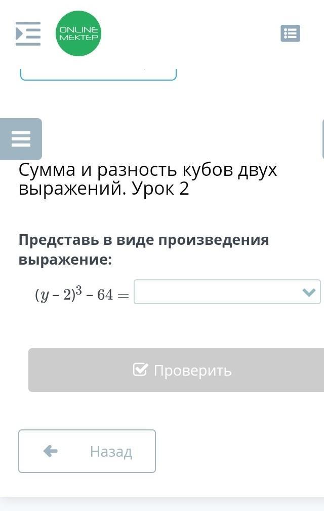 Представь в виде произведения выражение: (y – 2)3 – 64 =