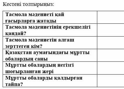 1.Тасмола мәдениеті біздің эрамызға дейінгі VII—III ғасырларға жатады.