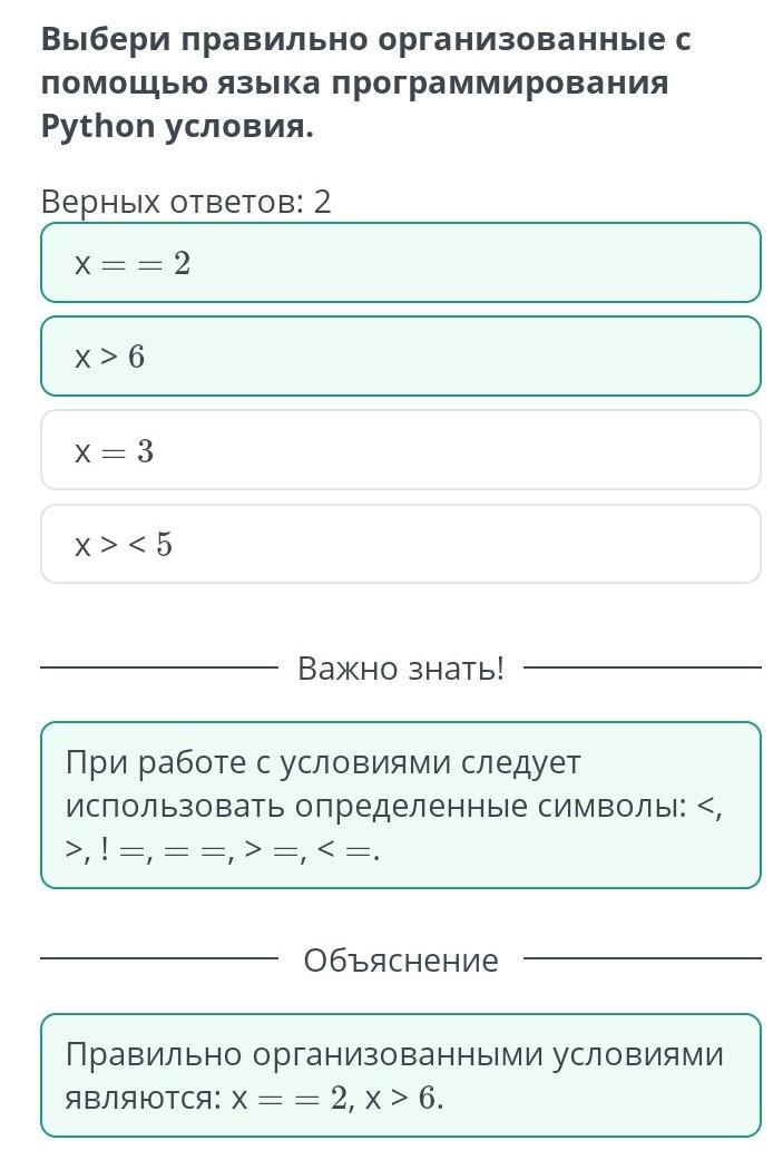 Выбери правильно организованные с помощью языка программирования Python условия.
