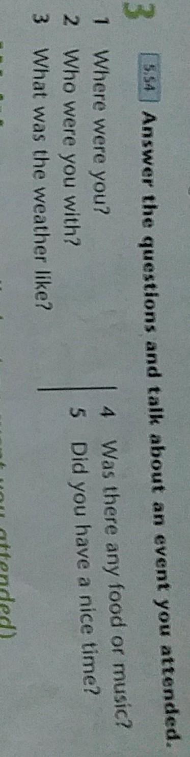 3.Answer the questions and talk about an event you attended. 1 Where were you? 2 Who were you with? 3 What was the weather like?4 Was there any food or music?5 Did you have a nice time?