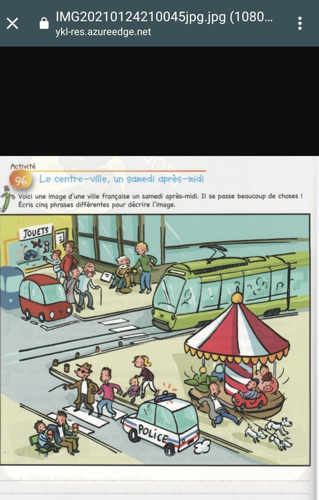 Voici une image d' une ville française un samedi aаpгёs-midi. II se passe beaucoup de choses! Еcris cing phrases differentes pour decrire 'image.