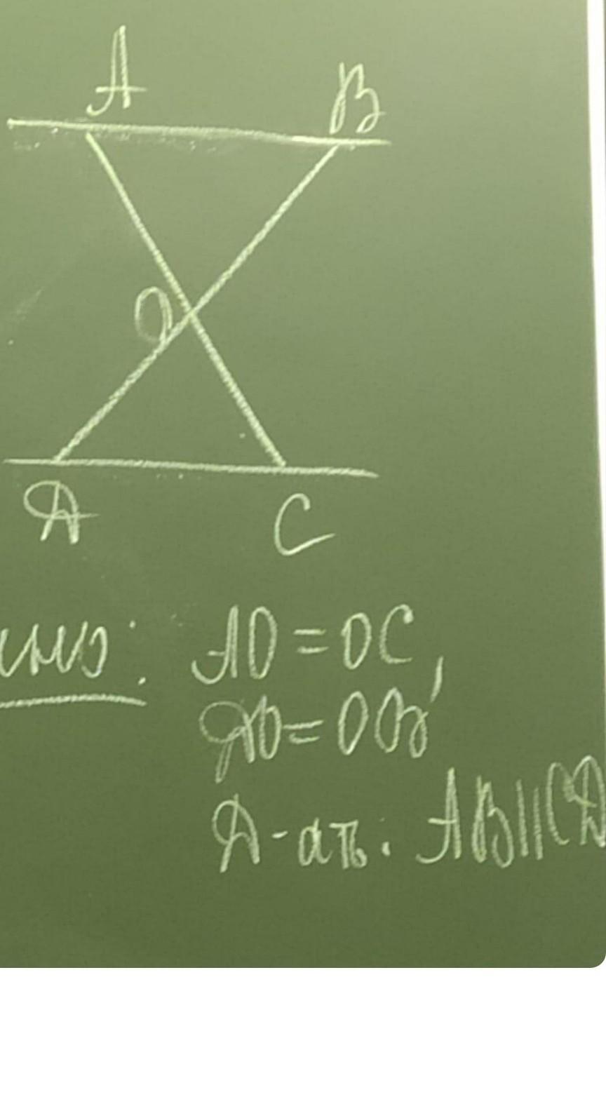 Из равенства треугольников следует, что ∠ ABO = ∠ ODC. Это - внутренние накрест лежащие при прямых AB и ВС, ⇒ прямые параллельны по признаку параллельности прямых.
