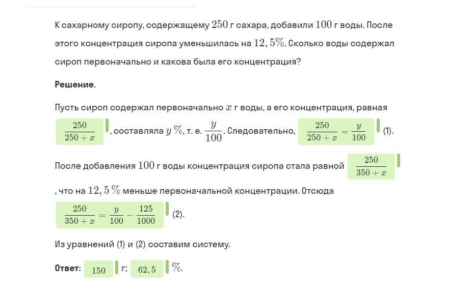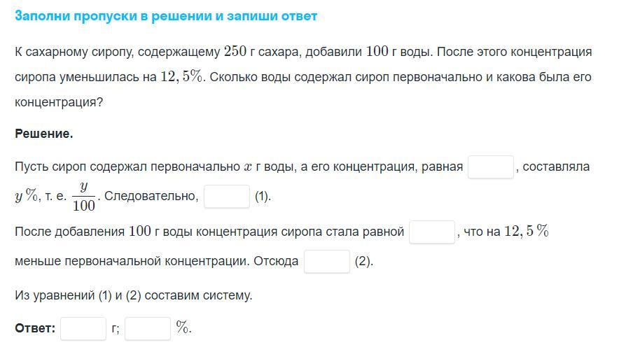 После добавления 100 грамм сиропа концентрация сиропа стала равной ____, что на 12,5% меньше первоначальной концентрации. Отсюда ____ (2)