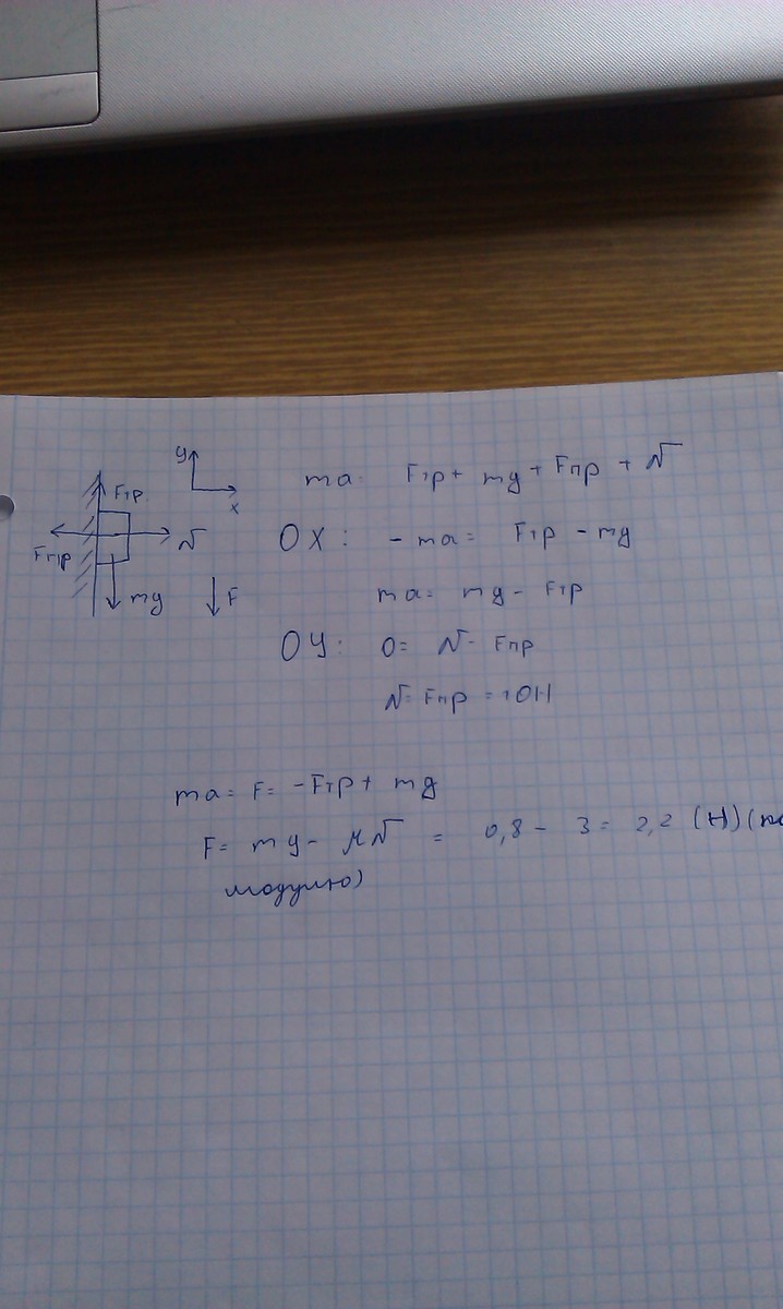 Магнит массой 80 г «прилип» к вертикальной стальной плите , притягиваясь к ней с силой 10 Н . Коэффициент трения между магнитом и плитой равен 0,3. Какую вертикально направленную силу надо приложить к магниту, чтобы он скользил по плите вниз?