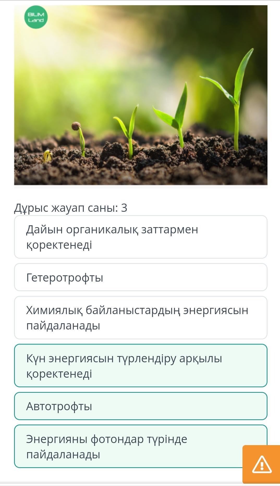 Суреттегі ағзаның қоректену тәсілін сипаттайтын тұжырымдарды көрсет. Дұрыс жауап саны: Гетеротрофты Химиялық байланыстардың энергиясын пайдаланады Автотрофты Дайын органикалық заттармен қоректенеді Күн энергиясын түрлендіру арқылы қоректенеді Энергияны фотондар түрінде пайдаланады