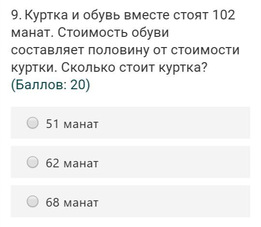 Kуртка и обувь вместе стоят 102 манат. Стоимость обуви составляет половину от стоимости куртки. Сколько стоит куртка? помогите пожалуйста??
