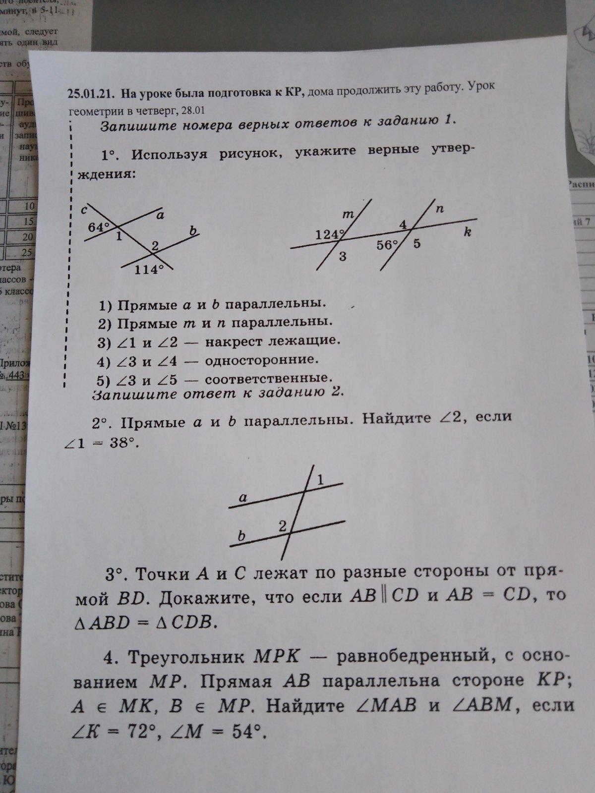 так как угол 3 вертикальный с углом 124°, то ∠3=124° , он и угол в 56° являются односторонними и их сумма равна 124+56=180, значит, прямые m и n параллельны (верный ответ2)