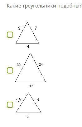 2 и 3 (их коэффициент подобия равен 4, так как если разделить соответственные стороны большего треугольника на стороны меньшего, то получится: 30/7,5=4. 24:6=4. 12/3=4)