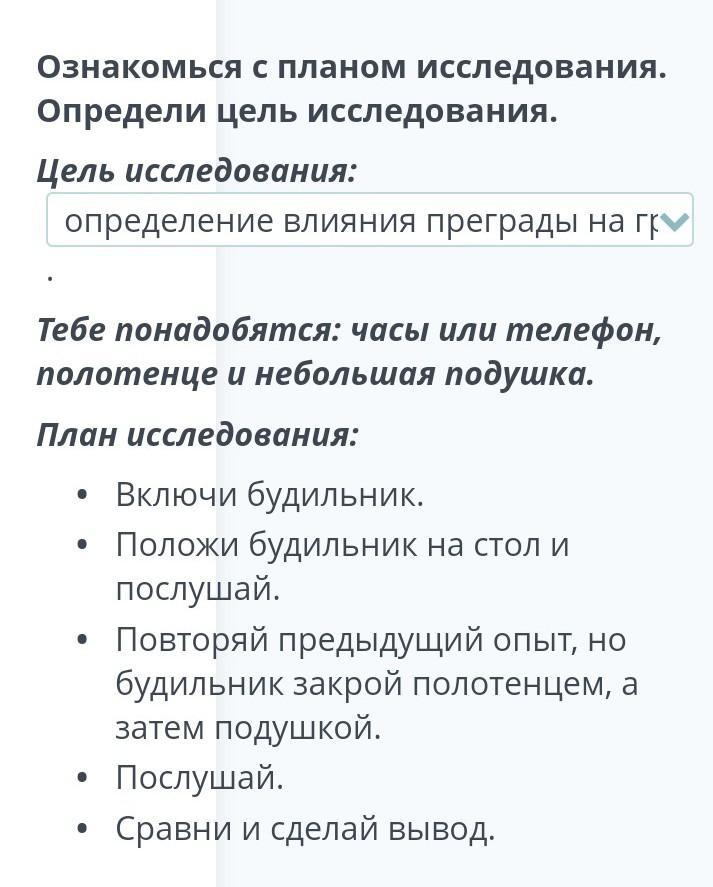 Цель исследования:1) определение высоких и низких звуков. 2)определение влияния преграды на громкость звука. Тебе понадобятся: часы или телефон, полотенце и небольшая подушка.