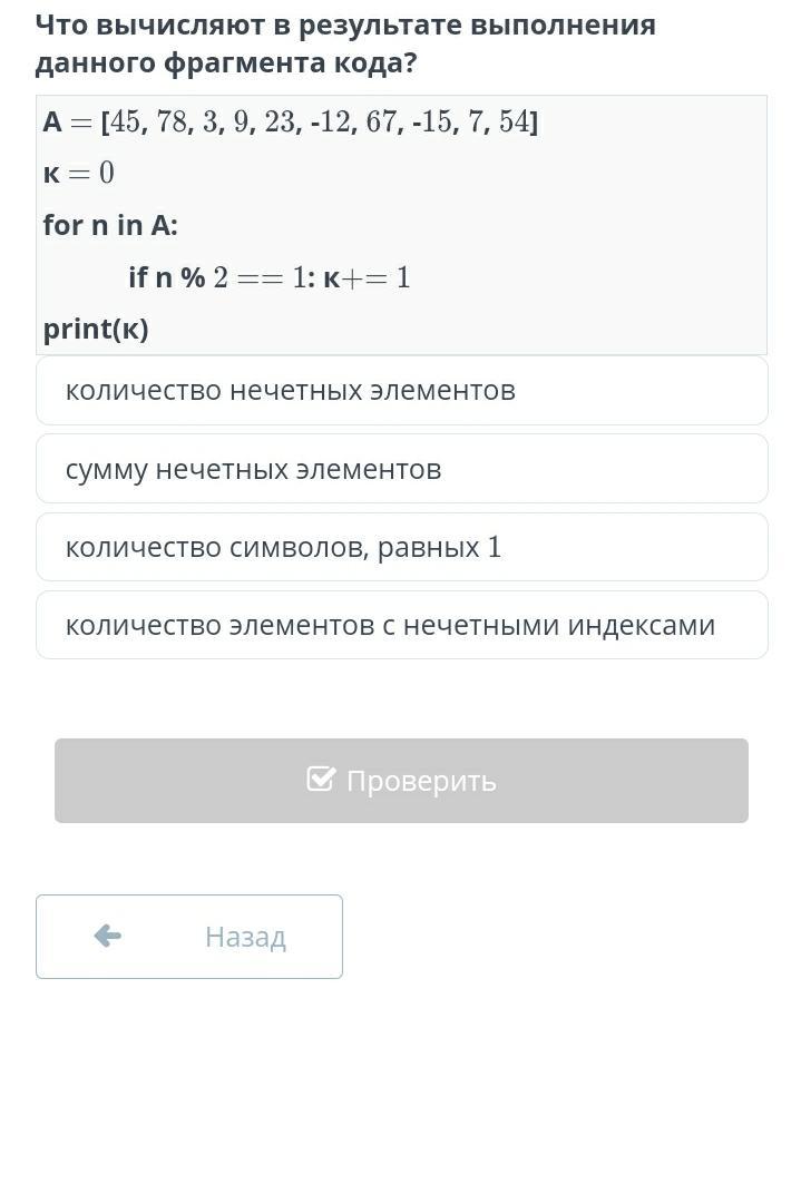 к = 0 for n in А: if n % 2 == 1: к+= 1
