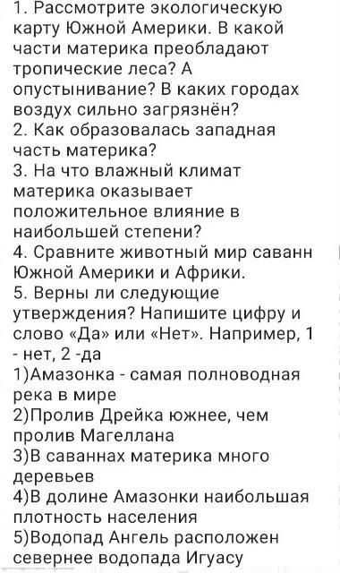 1. Тропические леса преобладают преимущественно на севере материка и районе близком к экватору. Опустынивание преобладает на юге материка от примероно 30 до 50 параллели. Наибольшее загрязнение воздуха отмечается в таких крупных городах как: Каракас, Рио-де-Жанейро, Буэнос-Айрес, Сан-Паулу, Богота, Лима, Сантьяго и т.д.