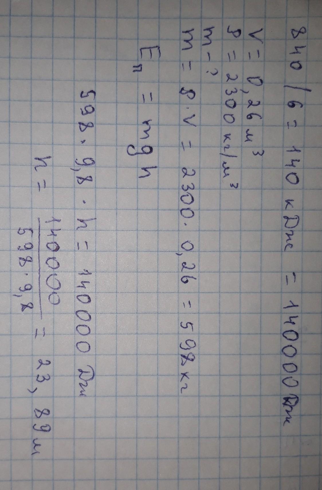Башенный кран, поднимая 6 бетонных блоков, соверил работу 840 кДж. Объем одного блока равен 0,26 м3, плотность бетона равна 2300 кг/м3. На какую высоту были подняты блоки?