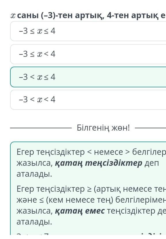 Санды теңсіздіктер және олардың қасиеттері. 1-сабақ x саны (–3)-тен артық, 4-тен артық емес. –3 ≤ x < 4 –3 < x < 4 –3 ≤ x ≤ 4 –3 < x ≤ 4