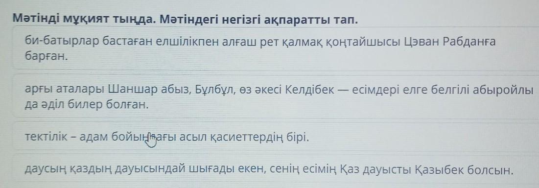 Мәтінді мұқият тыңда. Мәтіндегі негізгі ақпаратты тап.