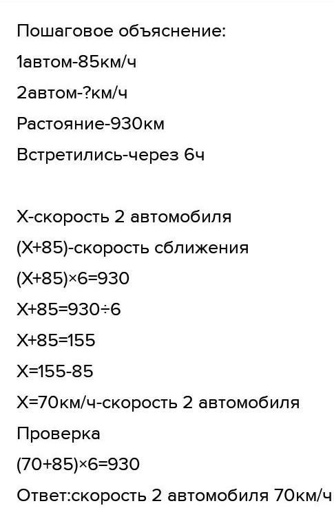 Из двух городов, расстояние между которыми 930 км, одновременно навстречу друг другу выехали два автомобиля и встретились через 6 часов. Один автомобиль ехал со скоростью 85 км/ч. Какова скорость второго автомобиля?
