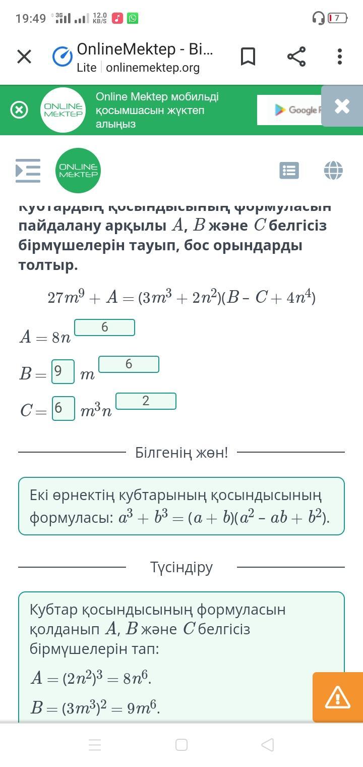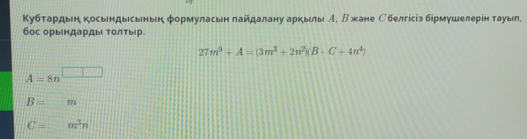 Кубтардың қосындысының формуласын пайдалану арқылы А, В және С белгісіз бірм