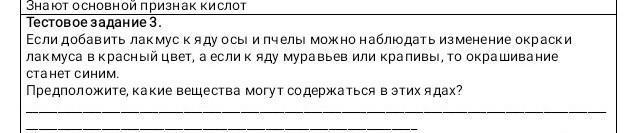 В яде осы и пчелы - кислота (красный лакмус), в яде муравья и крапивы - гидроксид ( синий лакмус)