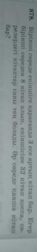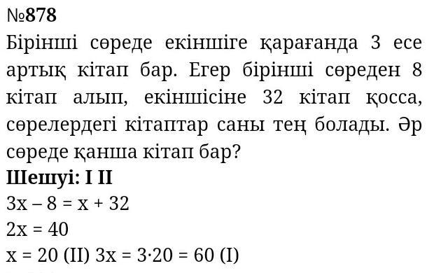 878. Бірінші сөреде екіншіге қарағанда 3 есе артық кітап бар . Егер бірінші сореден 8 кітап алып , екіншісіне 32 кітап қосса , со релердегі кітаптар саны тең болады . Әр сөреде қанша кітап бар ?