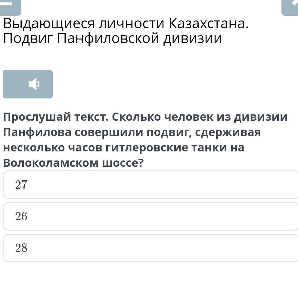 Прослушай текст. Сколько человек из дивизии Панфилова совершили подвиг, сдерживая несколько часов гитлеровские танки на Волоколамском шоссе?