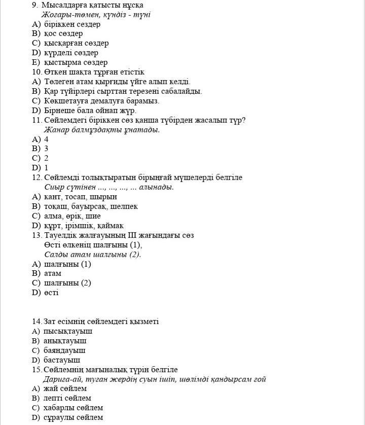 9. Мысалдарға қатысты нұсқа Жоғары - төмен , күндіз - түні А ) біріккен сездер В ) қос сөздер С ) қысқарған сөздер D ) күрделі сөздер E ) қыстырма сөздер 10. Өткен шақта тұрған етістік А ) Төлеген атам қырғиды үйге алып келді . В ) Қар түйірлері сырттан терезені сабалайды . C ) Көкшетауға демалуға барамыз . D ) Бірнеше бала ойнап жүр . 11. Сөйлемдегі біріккен сөз қанша түбірден жасалып тұр ? Жанар балмұздақты ұнатады , А ) 4 B ) 3 C ) 2 D ) 1 12. Сөйлемді толықтыратын бірыңғай мүшелерді белгіле Сиыр сүтінен ... , ... , ... , ... алынады . А ) кант , тосап , шырын В ) тоқаш , бауырсақ , шелпек С ) алма , өрік , шие D ) құрт , ірімшік , қаймак 13. Тауелдік жалғауының ІІ жағындағы сөз Өсті өлкенің шалғыны ( 1 ) , Салды атам шалғыны ( 2 ) . А ) шалғыны ( 1 ) В ) атам С ) шалғыны ( 2 ) D ) өсті 14. Зат есімнің сөйлемдегі қызметі А ) пысықтауыш В ) анықтауыш С ) баяндауыш D ) бастауыш 15. Сөйлемнің мағыналық түрін белгіле Дариға - ай , туған жердің суын ішіп , шөлiмдi қандырсам гой А ) жай сөйлем В ) лепті сөйлем С ) хабарлы сөйлем D ) сұраулы сөйлем