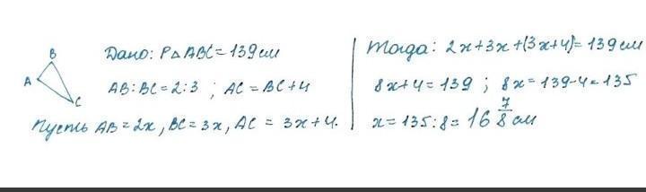 Периметр треугольника равен 138 см отношение двух сторон треугольника 2÷3 а третья сторона на 4 см больше второй Найдите все стороны