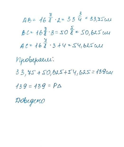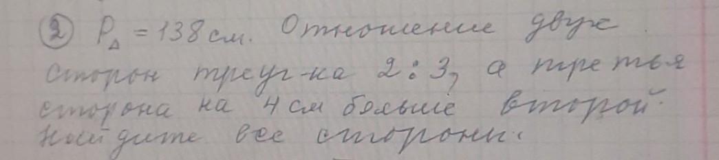 Периметр треугольника равен 138 см отношение двух сторон треугольника 2:3 а третья сторона на 4 см больше второй Найдите все стороны