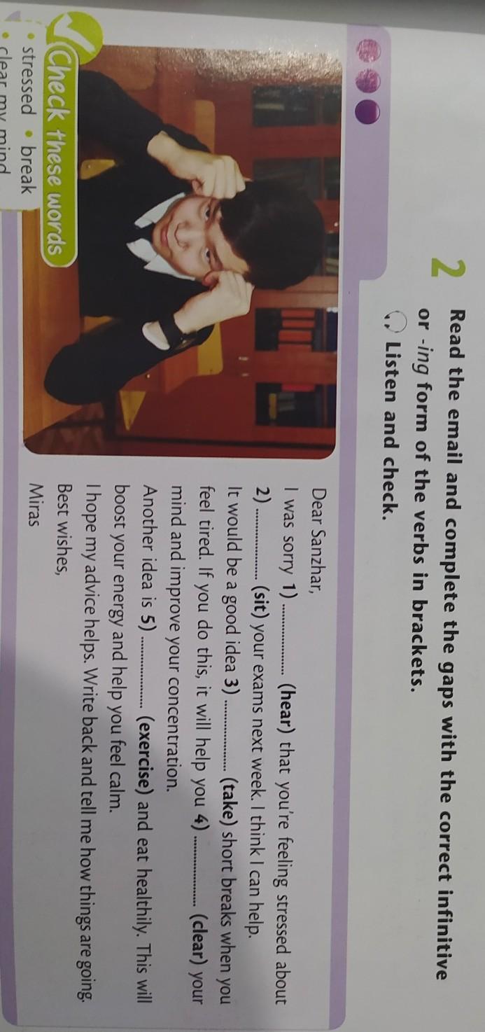1.hearing. 2. sitting. 3. taking. 4. clearing. 5 exercising.