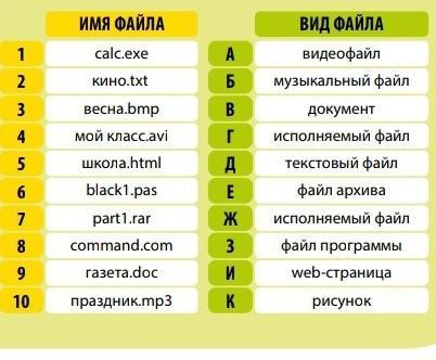 в таблице с права даны название фаелов установите соответствие между именем фаела и его видом