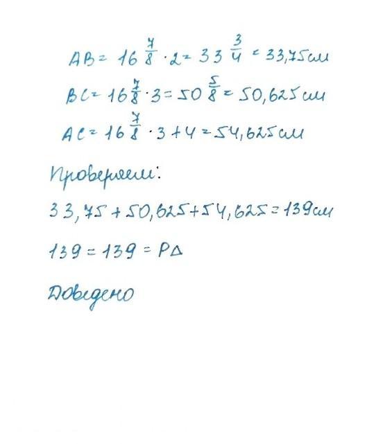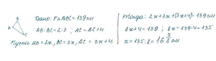 Р треугольника=139см.Отношение дауз сторон треугольника 2:3,а третья стороеа на 4см больше второй.Найдите все стороны.