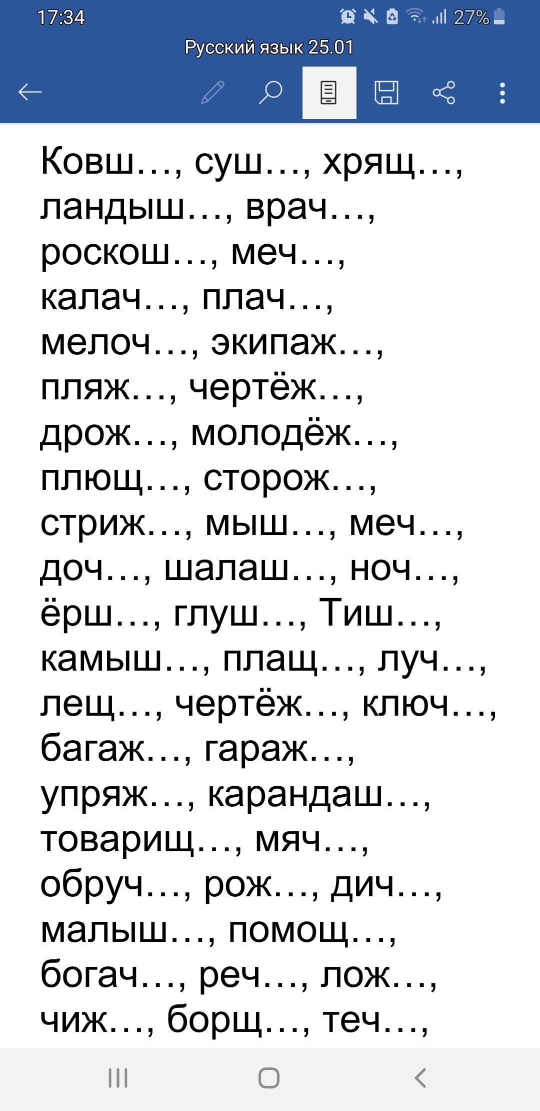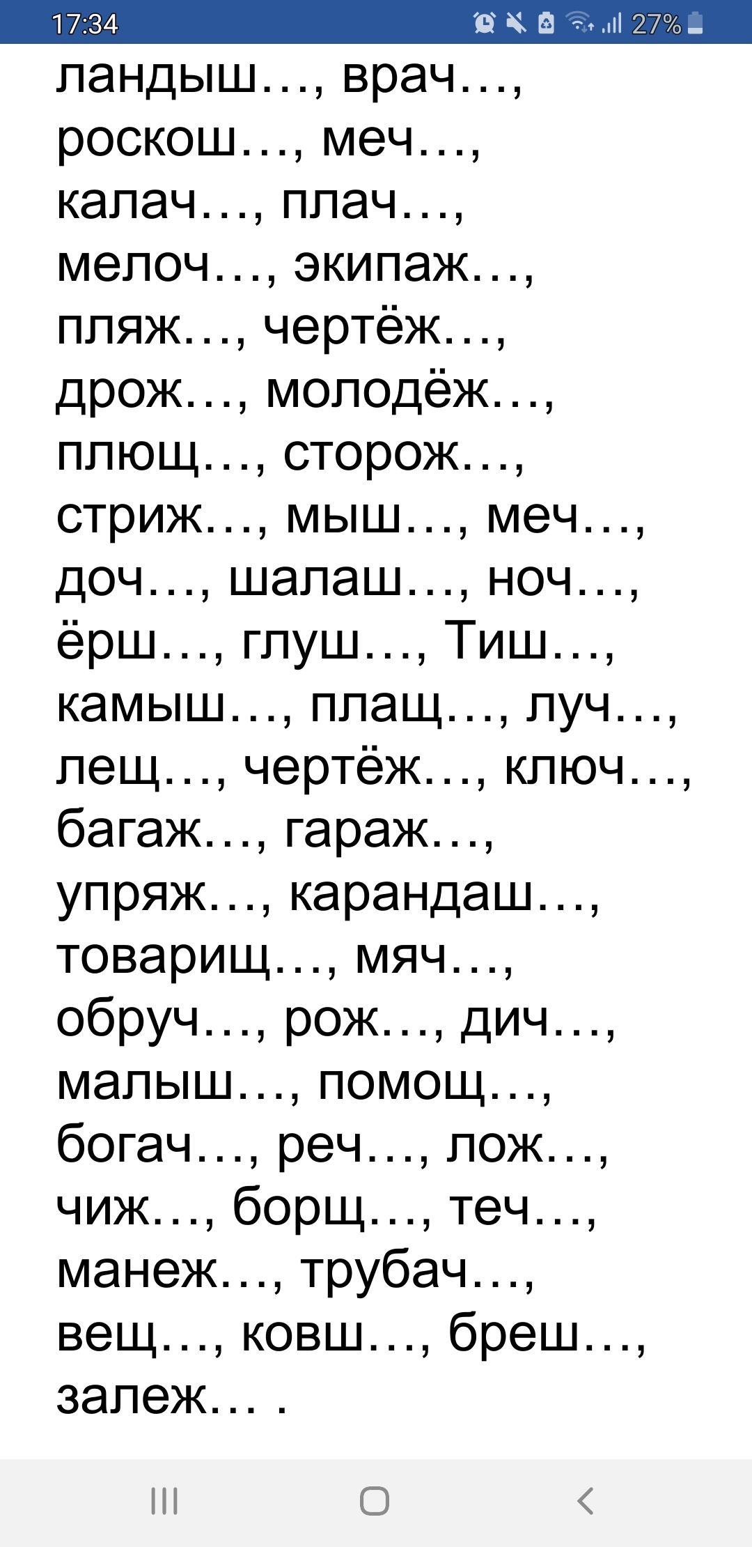 Ландыш, врач,роскошь,меч,калач,плачь,мелочь,экипаж,пляж,чертёж,дрожь,молодёжь,плющ,сторож,стриж,мышь,меч,дочь,шалаш,ночь,ёрш,глушь,Можно Тишь и можно Тиш,камыш,плащ,луч,лещ,ключ,багаж,гараж,упряжь,карандаш, товарищ,мяч,обруч,можно рож и можно рожь,дичь,малыш,помощь,багаж,гараж,упряжь,карандаш,товарищ,мяч,обруч рожь дичь малыш помощь богач речь ложь чиж борщ течь