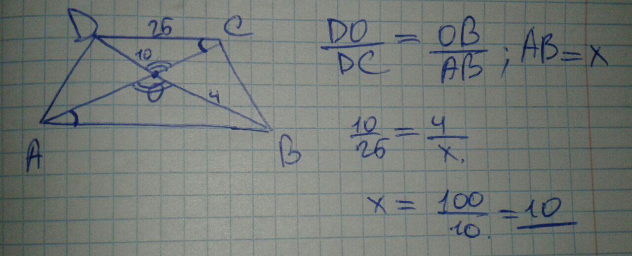 Диагонали трапеции ABCD с основанием AB и CD пересекаются в точке O. НАЙДИТЕ АВ, ЕСЛИ ОВ=4 СМ, ОD=10СМ, А DС=25СМ