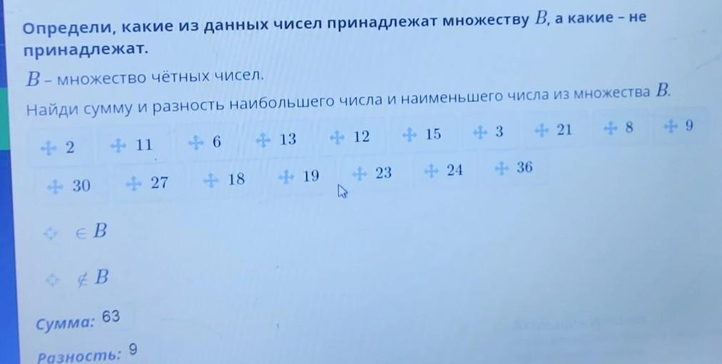 кто-то и нечетные числа Определи какие из данных чисел принадлежат выступ А какие не принадлежат B множество четных чисел Найди сумму и разность наибольшего числа и наименьшего числа из множества B 211 613 1215 32189 3718 32436