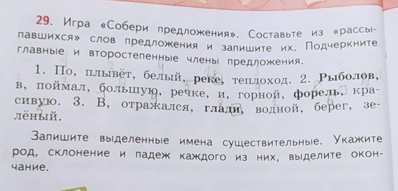 1. По, плывет, белый, реке, теплоход. 2. Рыболов,в,поймал,большую,речке,и,горной,красивую,форель. 3. B, отражался, глади, водной, берег, зелёный.